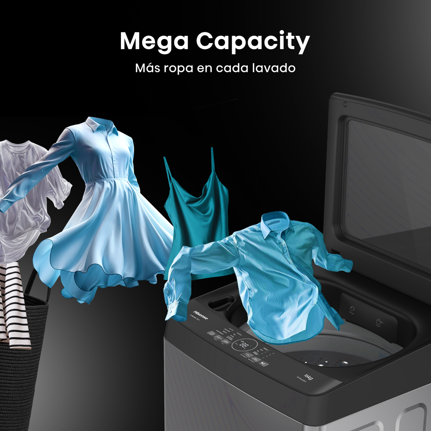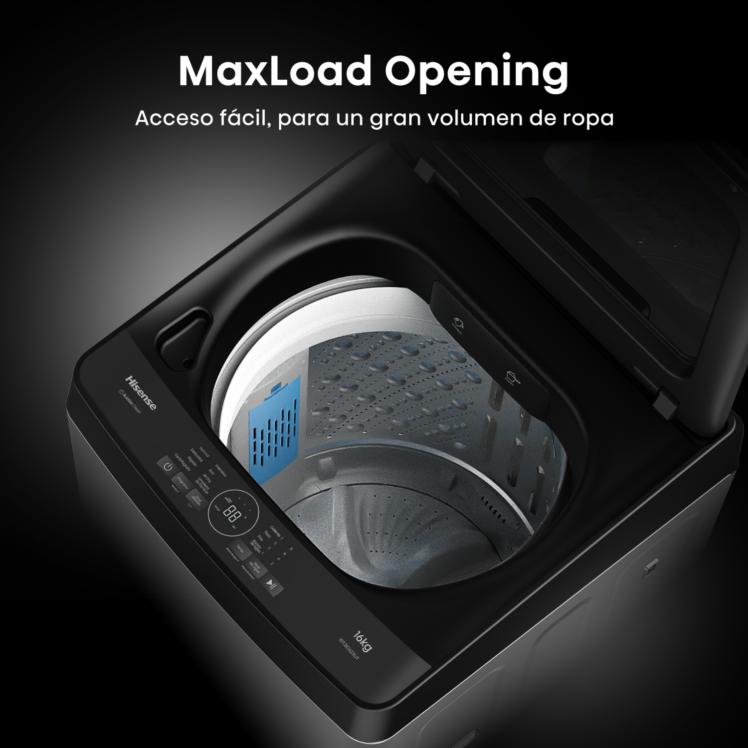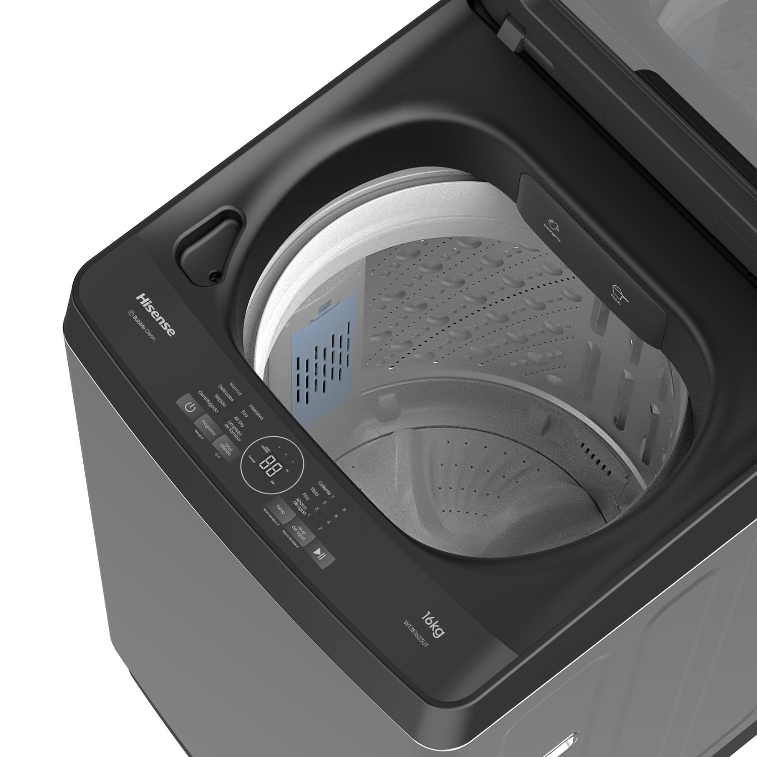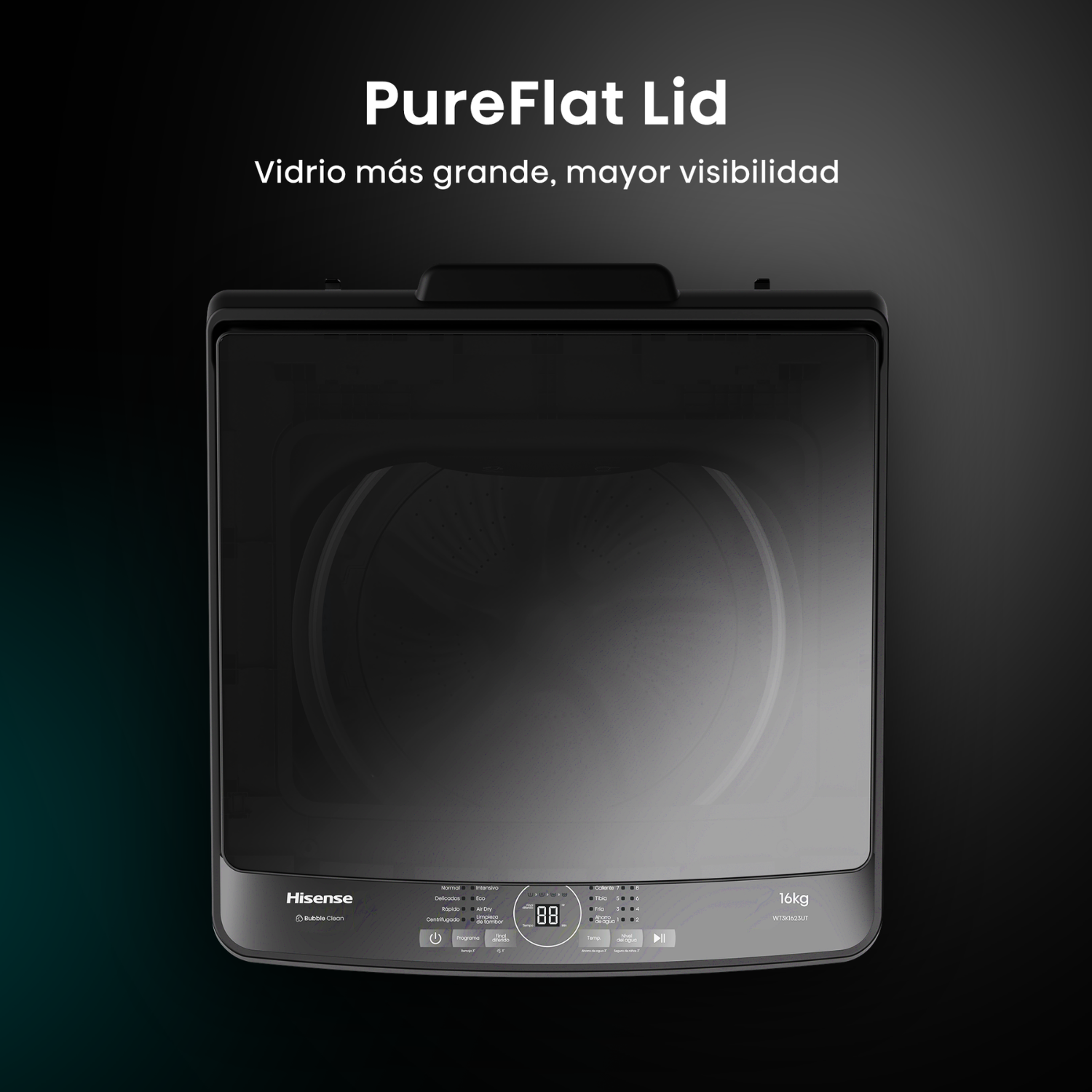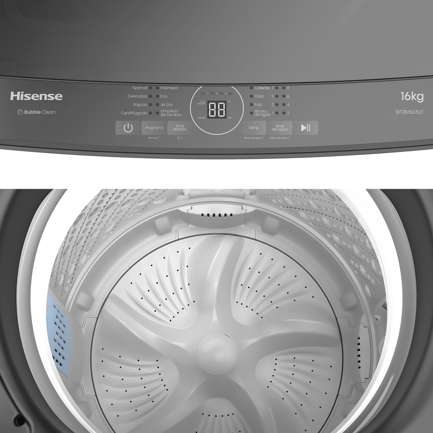 La Hisense WT3K1623UT es una lavadora automática de carga superior con capacidad de 16 kg, ideal para lavar grandes volúmenes de ropa. Su diseño moderno en gris titanio, con tapa de vidrio templado y panel frontal con pantalla LED, la hace funcional y estética.
