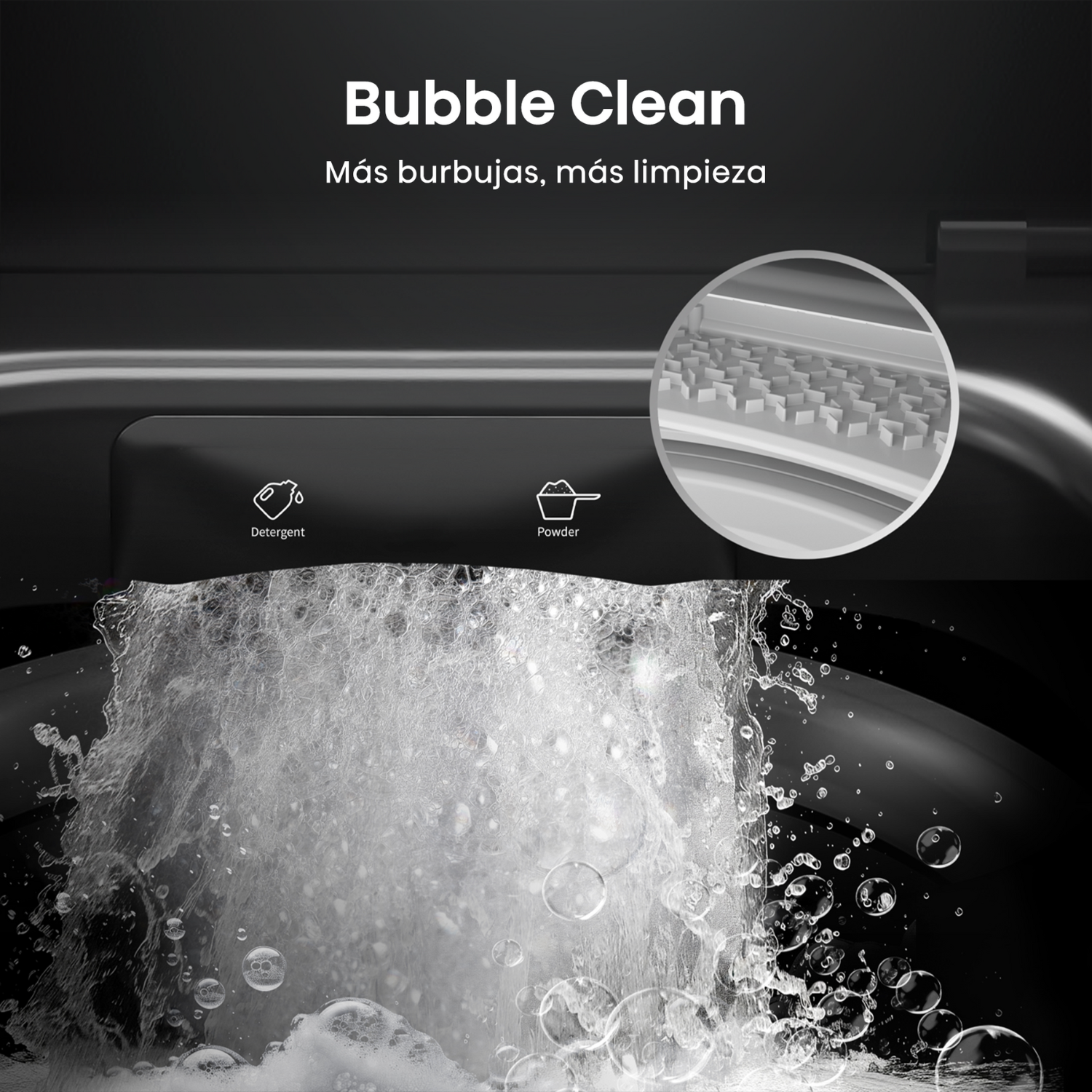 Ofrece 8 programas de lavado y funciones como Air Dry, remojo previo, control de temperatura, y 8 niveles de agua. Incorpora tecnologías como Bubble Clean, limpieza automática del tambor, bloqueo para niños, y reinicio automático.